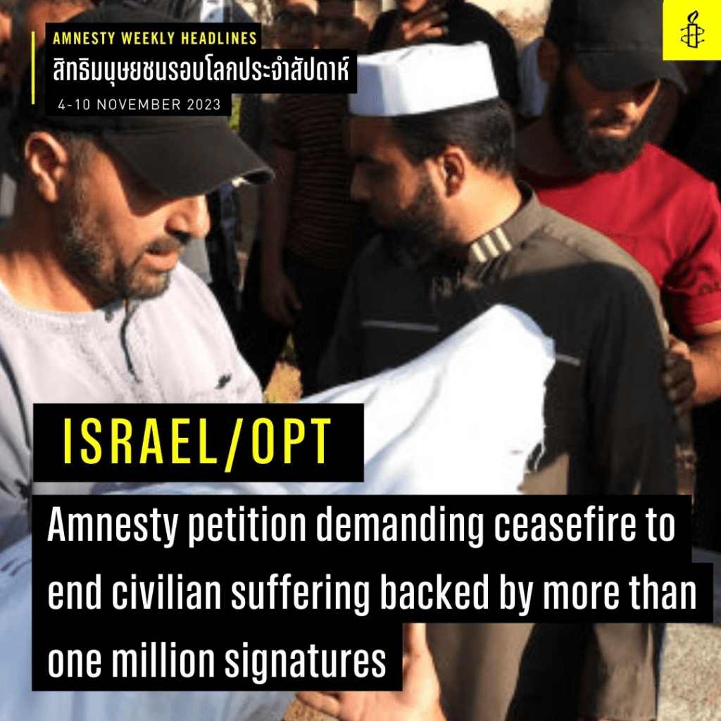 More than a million signatures from people around the world have been gathered for an Amnesty International petition demanding an immediate ceasefire to end the unparalleled escalation of hostilities in Gaza and Israel since 7 October 2023. In response, Erika Guevara-Rosas, Senior Director of Research, Advocacy, Policy and Campaigns at Amnesty International, said: