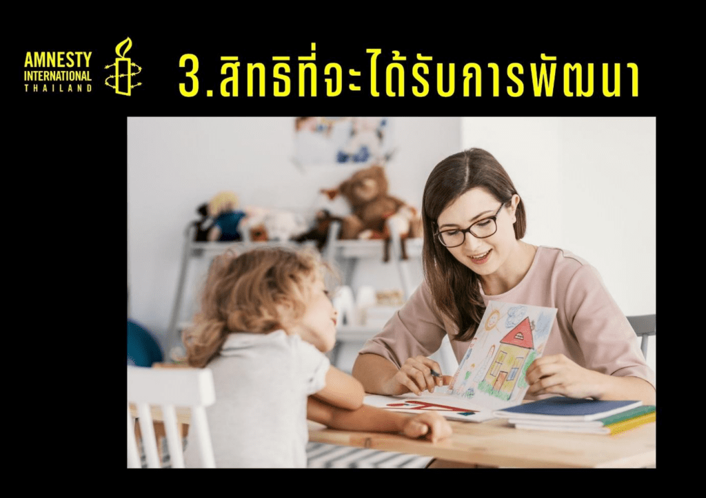 การศึกษาและพัฒนาการเป็นอีกเรื่องที่ต้องให้ความสำคัญ เริ่มตั้งแต่ที่เด็กๆ จะต้องได้รับบริการพัฒนาปฐมวัย และได้รับการศึกษาอย่างมีคุณภาพ รัฐต้องประกันสิทธิของเด็กที่จะได้รับการศึกษาอย่างเท่าเทียมกัน  ต้องมีจัดการศึกษาระดับประถมเป็นภาคบังคับที่เด็กทุกคนสามารถเรียนได้โดยไม่เสียค่าใช้จ่าย สนับสนุนการพัฒนาของการศึกษาระดับมัธยมในรูปแบบต่างๆ รวมถึงการศึกษาสายสามัญและสายอาชีพ จัดการศึกษาให้แพร่หลายและเปิดกว้างแก่เด็กทุกคน และดำเนินมาตรการที่เหมาะสม ทั้งการเข้าถึงข้อมูลข่าวสาร และการแนะแนวทางการศึกษาและอาชีพ ซึ่งรัฐต้องดำเนินมาตรการที่เหมาะสมที่จะประกันว่า ระเบียบวินัยของโรงเรียนได้กำหนดขึ้นในลักษณะที่สอดคล้องกับศักดิ์ศรีแห่งความเป็นมนุษย์ของเด็ก