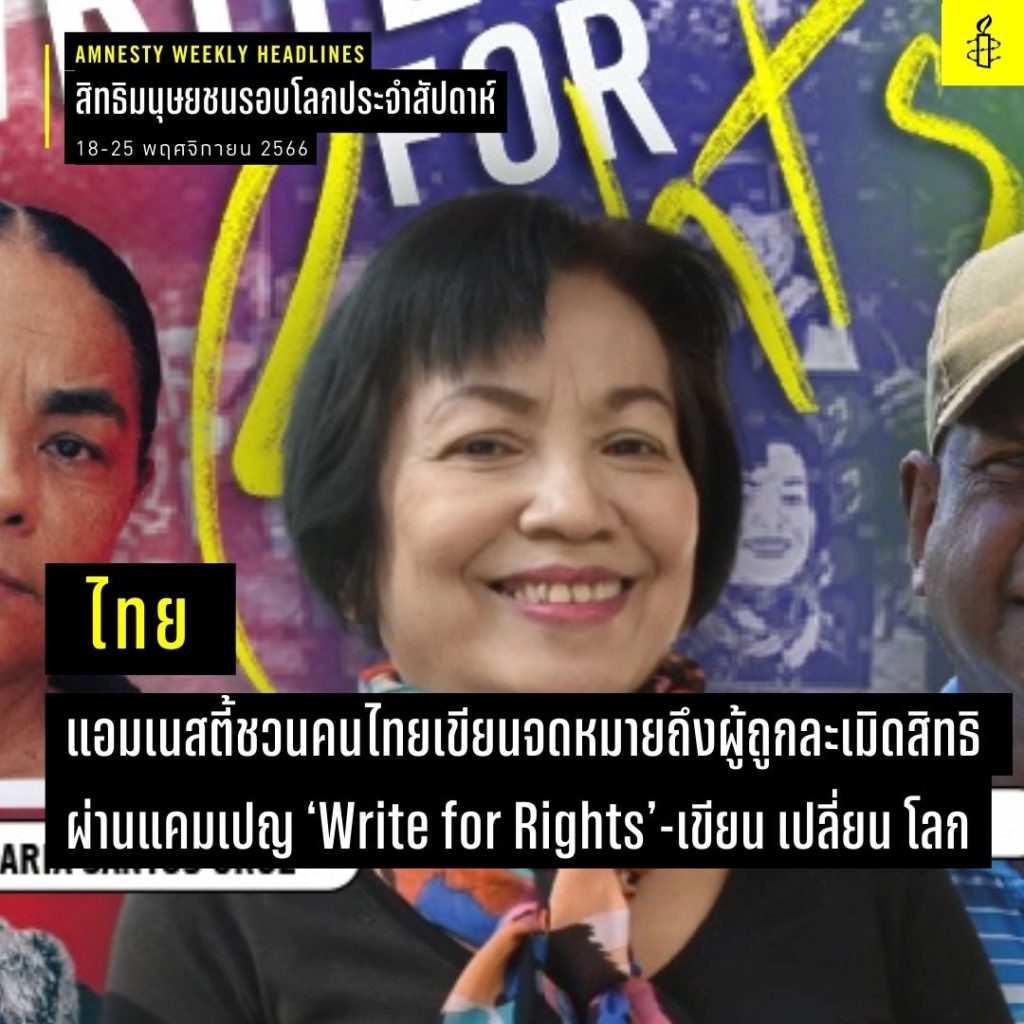 แอมเนสตี้ ประเทศไทยเปิดตัวแคมเปญ ‘Write for Rights’ หรือ ‘เขียน เปลี่ยน โลก’ กิจกรรมรณรงค์ด้านสิทธิมนุษยชนประจำปีที่ใหญ่สุดในโลก เชิญชวนคนไทยร่วมสร้างการเปลี่ยนแปลงไปกับคนทั่วโลกเพื่อปกป้องสิทธิมนุษยชนของผู้ถูกละเมิดทั่วโลกผ่านการเขียนจดหมายถึงพวกเขา โดยมีจุดประสงค์เพื่อไม่ให้ผู้ถูกละเมิดและครอบครัวของพวกเขารู้สึกว่ากำลังเผชิญอยู่กับการต่อสู้เพียงลำพัง นอกจากนี้ยังสามารถเขียนจดหมายถึงผู้มีอำนาจที่มีส่วนเกี่ยวข้องเพื่อให้ยุติการละเมิดสิทธิมนุษยชนและนำมาสู่ความยุติธรรม และเพื่อเป็นการสื่อสารไปทั่วโลกว่า ประชาชนทุกคนพร้อมที่จะยืนหยัดต่อสู้กับการใช้อำนาจโดยมิชอบไม่ว่าการใช้อำนาจนั้นจะเกิดที่ใดบนโลกก็ตาม โดยกิจกรรมนี้ได้จัดต่อเนื่องมาเป็นปีที่ 22 แล้ว