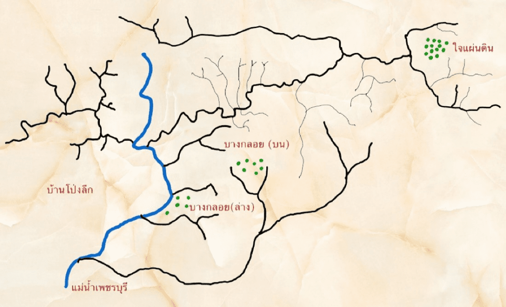 หากดูตามแผนที่ในรูปภาพเราจะเห็นว่า ‘หมู่บ้านบางกลอย’ โดยเริ่มจากบางกลอยล่างเป็นพื้นที่ที่รัฐจัดสรรไว้ให้ในปี 2539 ซึ่งดูตามแผนที่จะใช้ชื่อเรียกใหม่ว่า ‘บางกลอยล่าง’ ถ้าเดินตามฝีเท้าของชาวกะเหรี่ยงไปอีก 1 วัน จะไปถึงจุดที่เรียกว่า ‘บางกลอยบน’และหากเดินด้วยฝีเท้าของชาวกะเหรี่ยงจาก ‘บางกลอยล่าง’ ผ่าน ‘บางกลอยบน’ ไปถึง ‘ใจแผ่นดิน’ ซึ่งเป็นบ้านของ ‘ปู่คออี้’ จะใช้เวลาเดินทาง 3 วัน