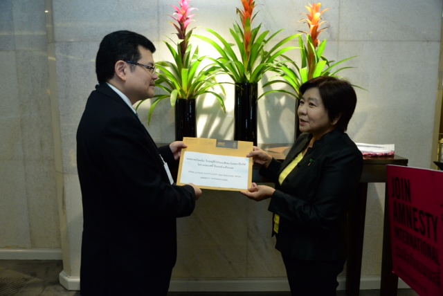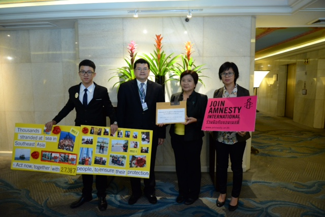 สมาชิกแอมเนสตี้ อินเตอร์เนชั่นแนลในประเทศไทย ยื่นจดหมายเปิดผนึกของเลขาธิการจากกรุงลอนดอน ประเทศอังกฤษถึงผู้นำประเทศต่างๆ โดยผ่านนายเสข วรรณเมธี อธิบดีกรมสารนิเทศ กระทรวงการต่างประเทศ ตัวแทนรัฐบาลไทยในฐานะเจ้าภาพจัดการประชุมสุดยอดภูมิภาคว่าด้วยการอพยพที่ไม่ปรกติ เพื่อสนับสนุนและยื่นข้อเสนอแนะในการร่วมมือกันหามาตรการระดับประเทศและภูมิภาคเพื่อการแก้ไขวิกฤตผู้ลี้ภัยในภูมิภาคตะวันออกเฉียงใต้ พร้อมทั้งนำเสนอตัวเลขผู้สนับสนุนทั่วโลกในการรณรงค์ “ปฏิบัติการด่วน” เพื่อช่วยเหลือผู้ลี้ภัยที่เผชิญความเสี่ยงอยู่กลางทะเลกว่า 6,000 คน โดยมีผู้สนับสนุนร่วมลงชื่อกว่า 27,000 คน ซึ่งรายชื่อดังกล่าวจะรวบรวมส่งถึงรัฐบาลที่เกี่ยวข้องต่อไป