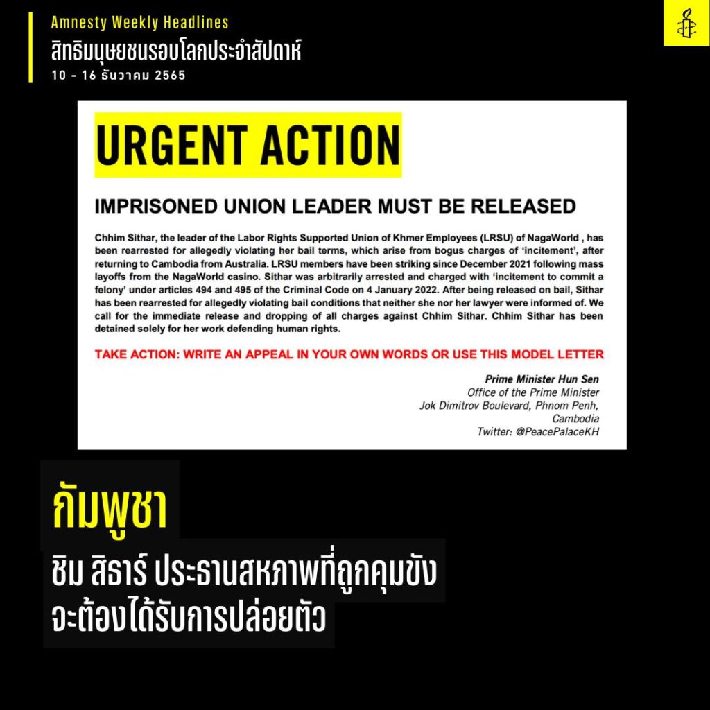 เราขอเรียกร้องให้มีการปล่อยตัวชิม สิธาร์ในทันทีและยุติข้อกล่าวหาทั้งหมด ชิม สิธาร์ ถูกคุมขังเพียงเพราะงานของเธอปกป้องสิทธิมนุษยชน
