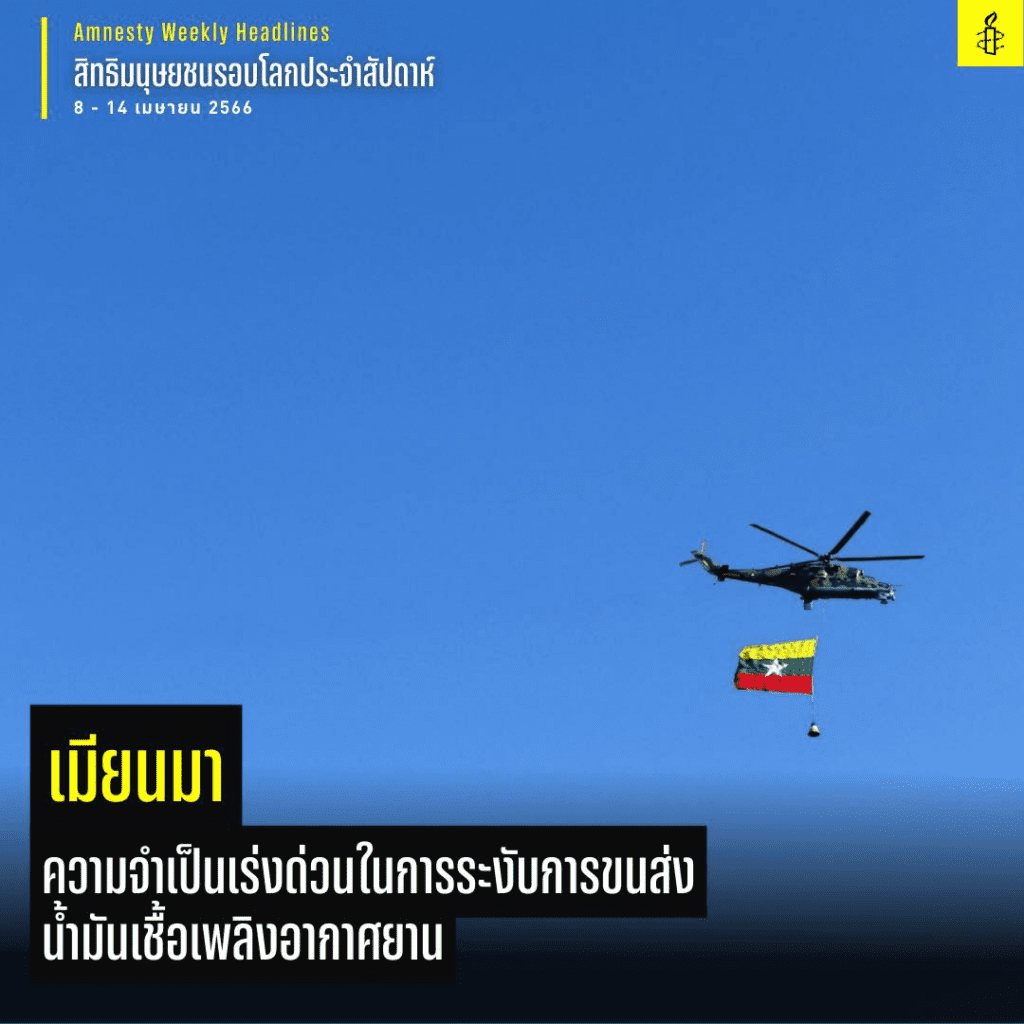 “การโจมตีทางอากาศอย่างต่อเนื่องทั่วเมียนมา เน้นย้ำถึงความจำเป็นอย่างเร่งด่วนในการระงับการนำเข้าเชื้อเพลิงอากาศยาน แอมเนสตี้ขอย้ำถึงการเรียกร้องให้ทุกรัฐและธุรกิจต่างๆ ยุติการส่งสินค้าที่อาจตกไปอยู่ในมือของกองทัพอากาศเมียนมา ห่วงโซ่อุปทานนี้ก่อให้เกิดการละเมิดกฎหมายมนุษยธรรมระหว่างประเทศ ซึ่งรวมถึงอาชญากรรมสงคราม และจะต้องหยุดชะงักเพื่อช่วยชีวิตผู้คน”