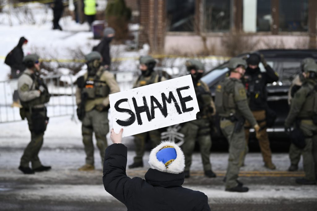 ผู้คนที่อยู่ในเหตุการณ์ถือป้ายข้อความว่า “อับอาย” ขณะเจ้าหน้าที่บังคับใช้กฎหมายปฏิบัติการหลังเหตุยิงที่เกิดขึ้นในมินนิแอโพลิส ซึ่งถูกถ่ายภาพไว้ในพื้นที่ขณะเจ้าหน้าที่กำลังทำงานในที่เกิดเหตุ. กระทรวงความมั่นคงแห่งมาตุภูมิของสหรัฐฯ ระบุว่าการยิงครั้งนี้เกิดขึ้นระหว่างปฏิบัติการบังคับใช้กฎหมายตรวจคนเข้าเมืองโดยเจ้าหน้าที่ของสำนักงานตรวจคนเข้าเมืองและศุลกากร (ICE) ซึ่งฝ่ายรัฐบาลกล่าวว่าเจ้าหน้าที่ยิงเป็นการป้องกันตัว แต่เหตุการณ์ได้จุดชนวนให้มีการตั้งคำถามถึงการใช้กำลังถึงชีวิตโดยเจ้าหน้าที่รัฐ และนำไปสู่การประณามอย่างกว้างขวางจากชุมชนท้องถิ่นและผู้สนับสนุนสิทธิมนุษยชน.