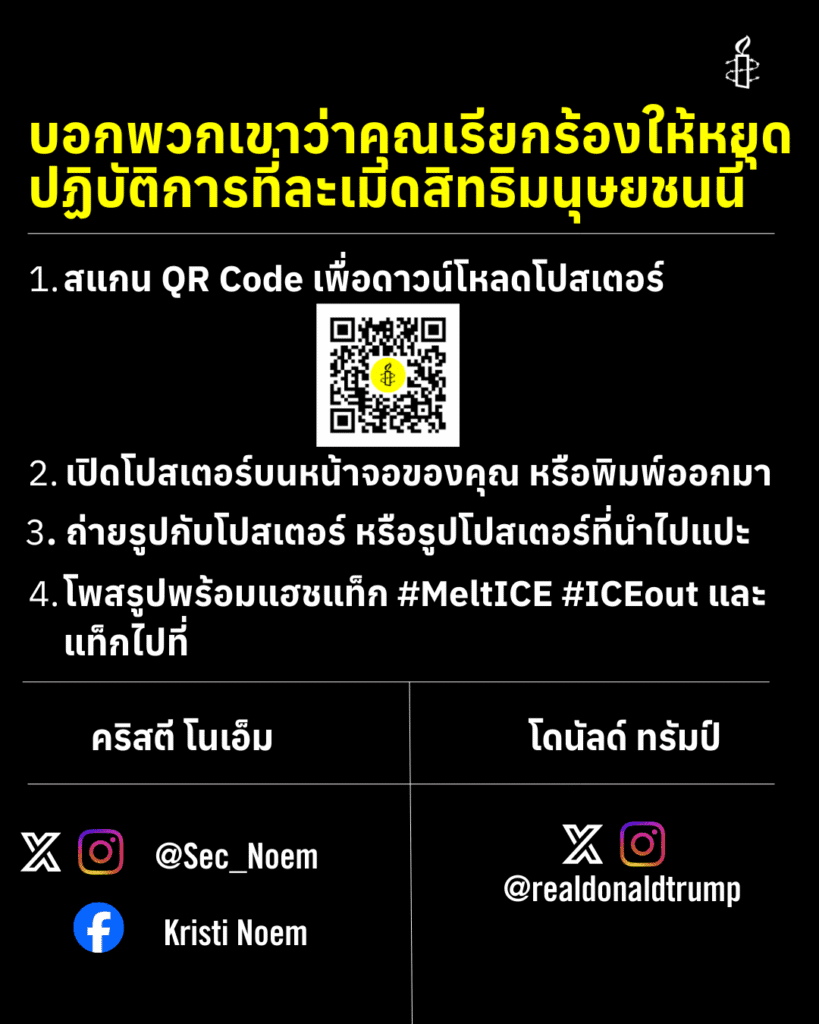 - ยุติการจัดสรรงบประมาณที่สนับสนุนการละเมิดสิทธิฯ: กดดันให้สภาคองเกรสตัดลดงบประมาณของสำนักงานตรวจคนเข้าเมืองและศุลกากร (ICE) และหน่วยลาดตระเวนชายแดน (Border Patrol) ที่ถูกนำมาใช้เพื่อคุกคามชุมชน