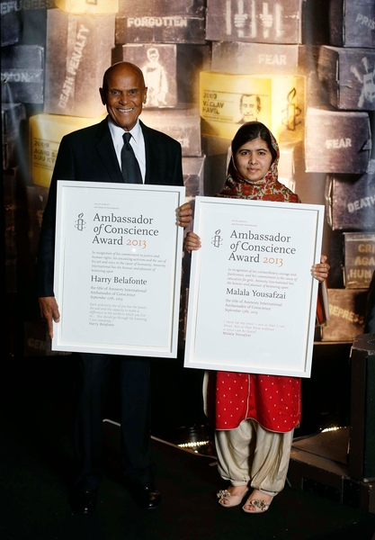 เมื่อวันที่ 17 กันยายน 2556 แอมเนสตี้ อินเตอร์เนชั่นแนล มอบรางวัลทูตมโนธรรมสำนึก (Amnesty International Ambassador of Conscience Award) ประจำปี 2556 ซึ่งเป็นรางวัลเกียรติยศสูงสุดด้านสิทธิมนุษยชนให้แก่ มาลาลา ยูซาฟไซ และแฮร์รี เบลาฟอนเต้ นักร้องชาวอเมริกันและนักเคลื่อนไหวเพื่อสิทธิมนุษยชน ซึ่งรางวัลนี้จะมอบให้แก่บุคคลที่แสดงออกถึงความเป็นผู้นำในการต่อสู้เพื่อปกป้อง และส่งเสริมสิทธิมนุษยชน